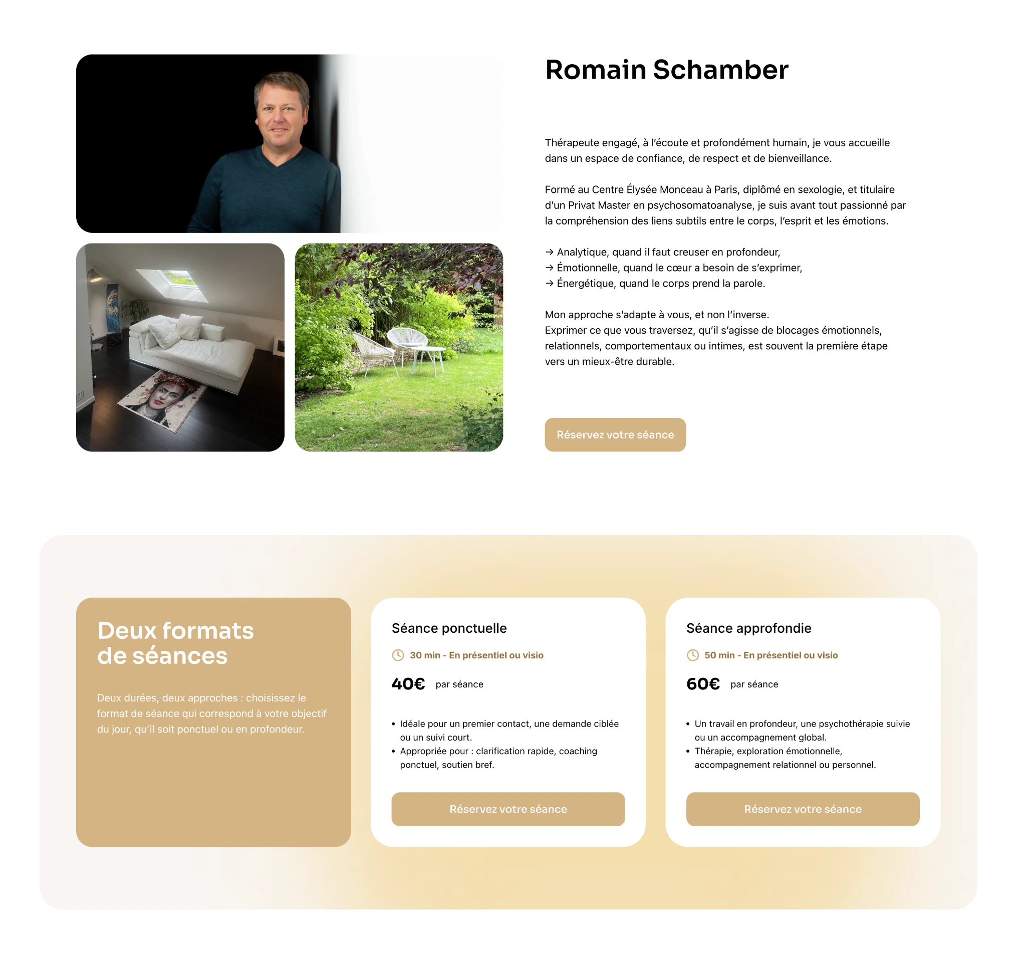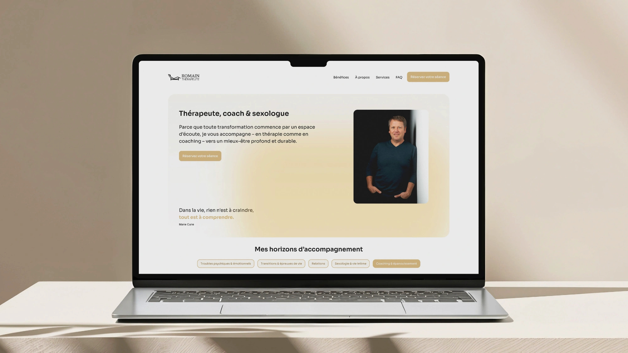 Construire un site vitrine qui introduit les services thérapeutiques de Romain ainsi qu’une identité visuelle efficace.